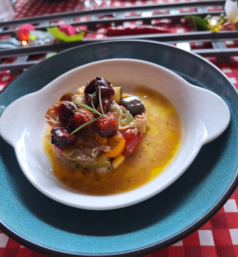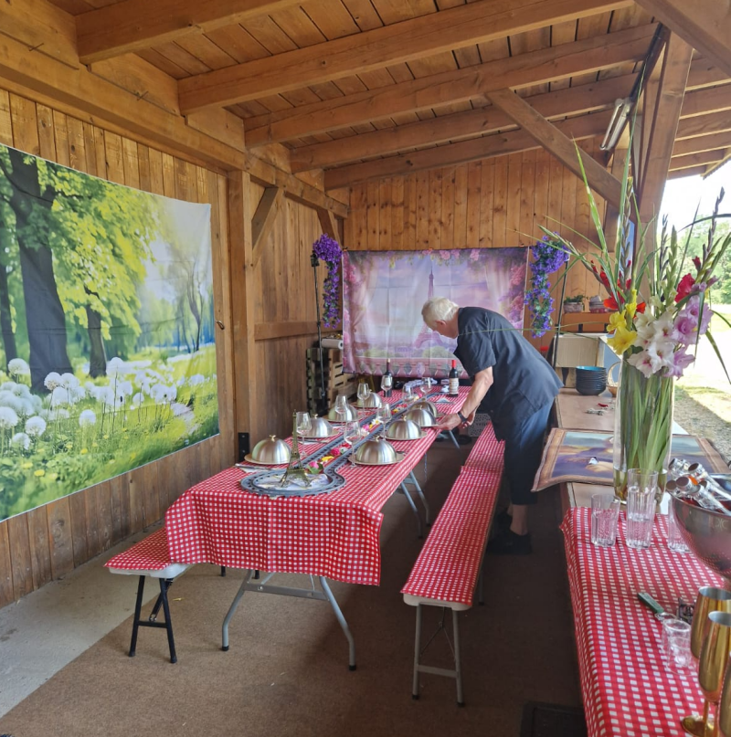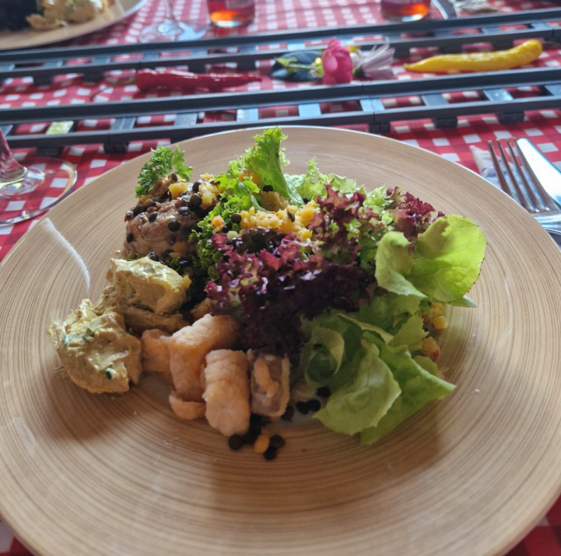 *Mousse de Canard*Gemüse-Terrine*Trüffel Pastete*Maispoularde mit Trüffel und gebackene Kirschkapern* Tunfisch Tatar mit Rogen vom Fliegenfisch*Ratatouille-salat mit scharf angebratener Merguez*Crêpes*Petit fours*Käse Langres*Münsterkäse angemacht*Crème Brûlée*Quiche Lorraine